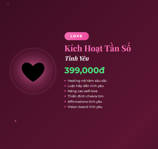 Khóa học Kích hoạt tần số tình yêu là một chương trình đặc biệt được thiết kế để giúp bạn mở rộng năng lực yêu thương và thu hút tình yêu vào cuộc sống của mình. Thông qua các kỹ thuật và bài tập thực tế, bạn sẽ học cách điều chỉnh tần số cảm xúc, tăng cường sức mạnh của tâm trí, và tạo ra môi trường thuận lợi cho tình yêu thật sự.